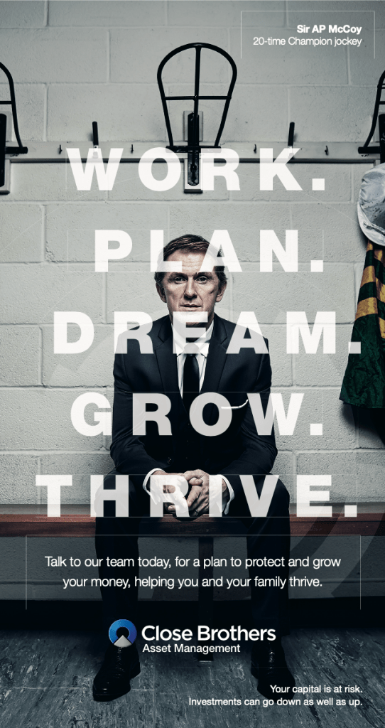Brief: Horse racing is a sport enjoyed by Close Brothers’ wealth management clients and self-employed small business owners alike. And so, Sir AP McCoy (a 20-time Champion jockey) was selected to be our brand ambassador. How to seamlessly link him with our messaging was up to us.